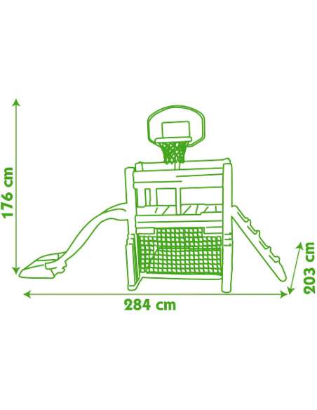 Zona multideportiva equipada con 1 tobogán de longitud 1,5 m, 1 canasta de baloncesto, 1 portería de fútbol, 1 pared de escalada y una escalera.